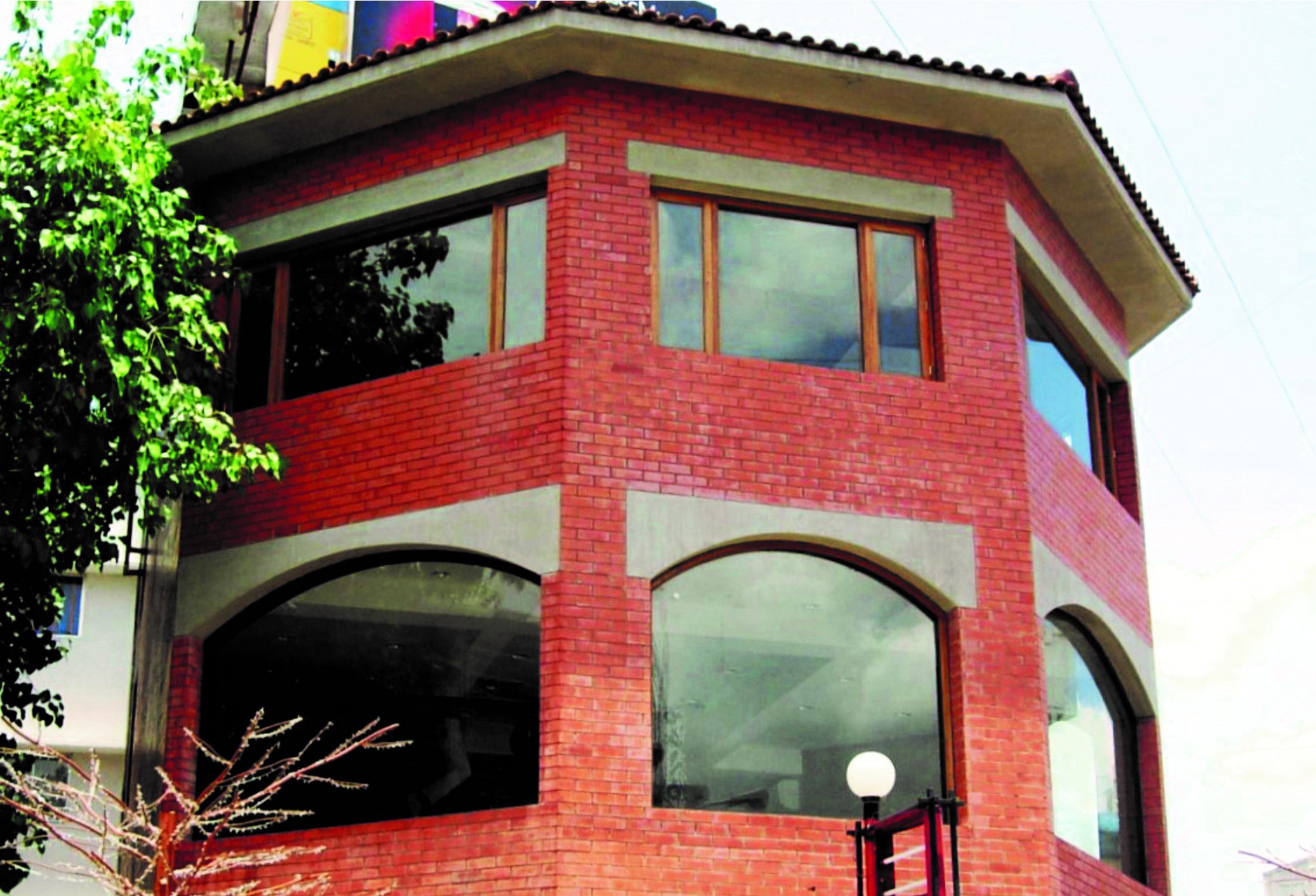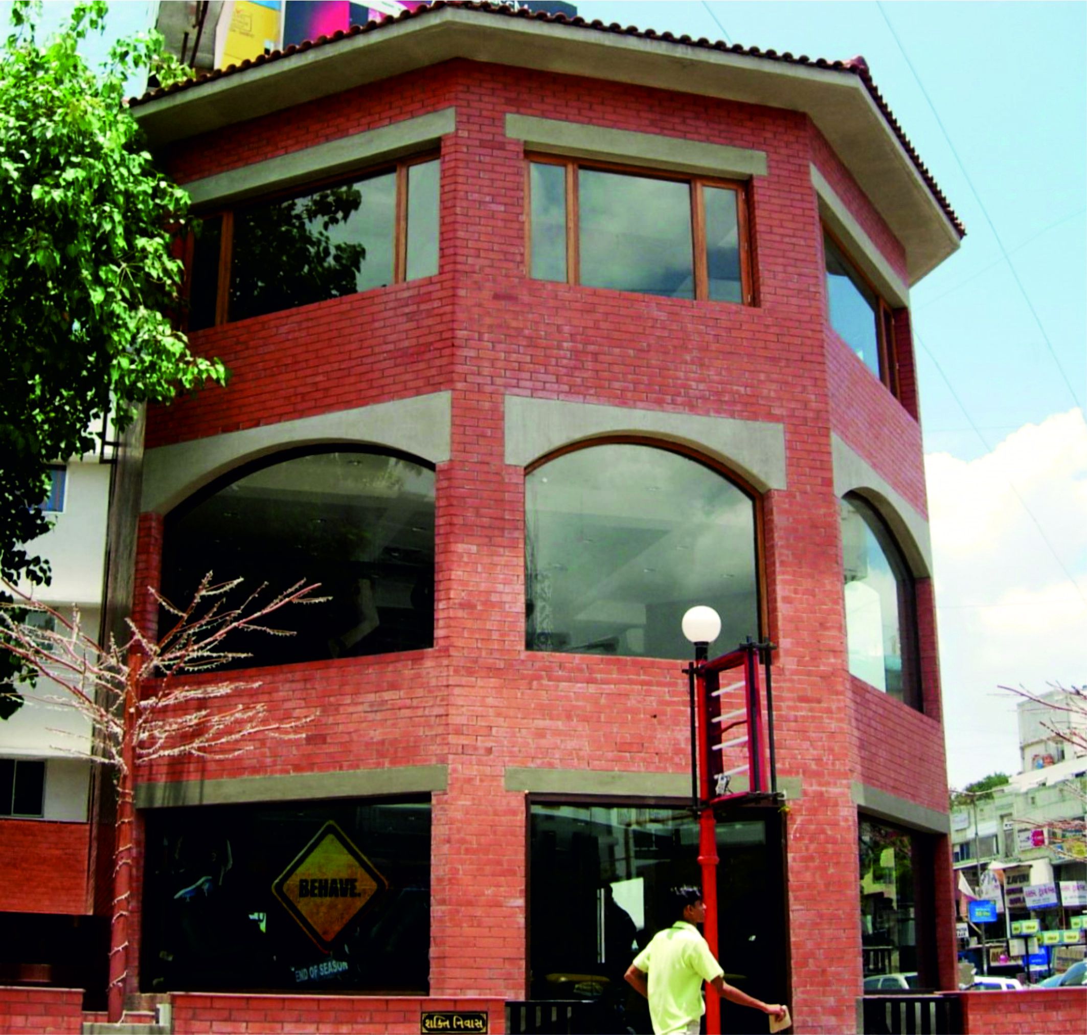 Sitting on a corner junction of one of the busiest cross roads, this building stands out amidst the other horizontally spread out commercial complexes. The main intention behind the creation of this building was to create a landmark. Due to its pentagonal form, it not only is in affinity with the curvature of the cross-road, but also can be easily related to other three junctions.