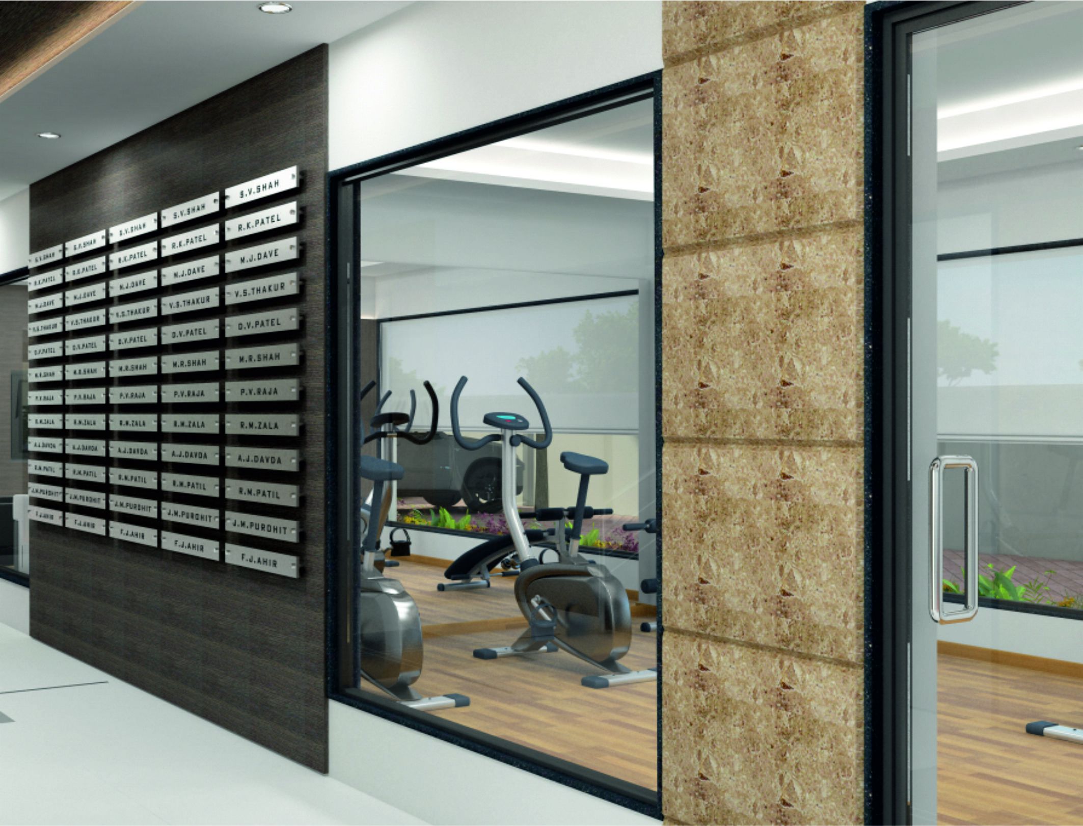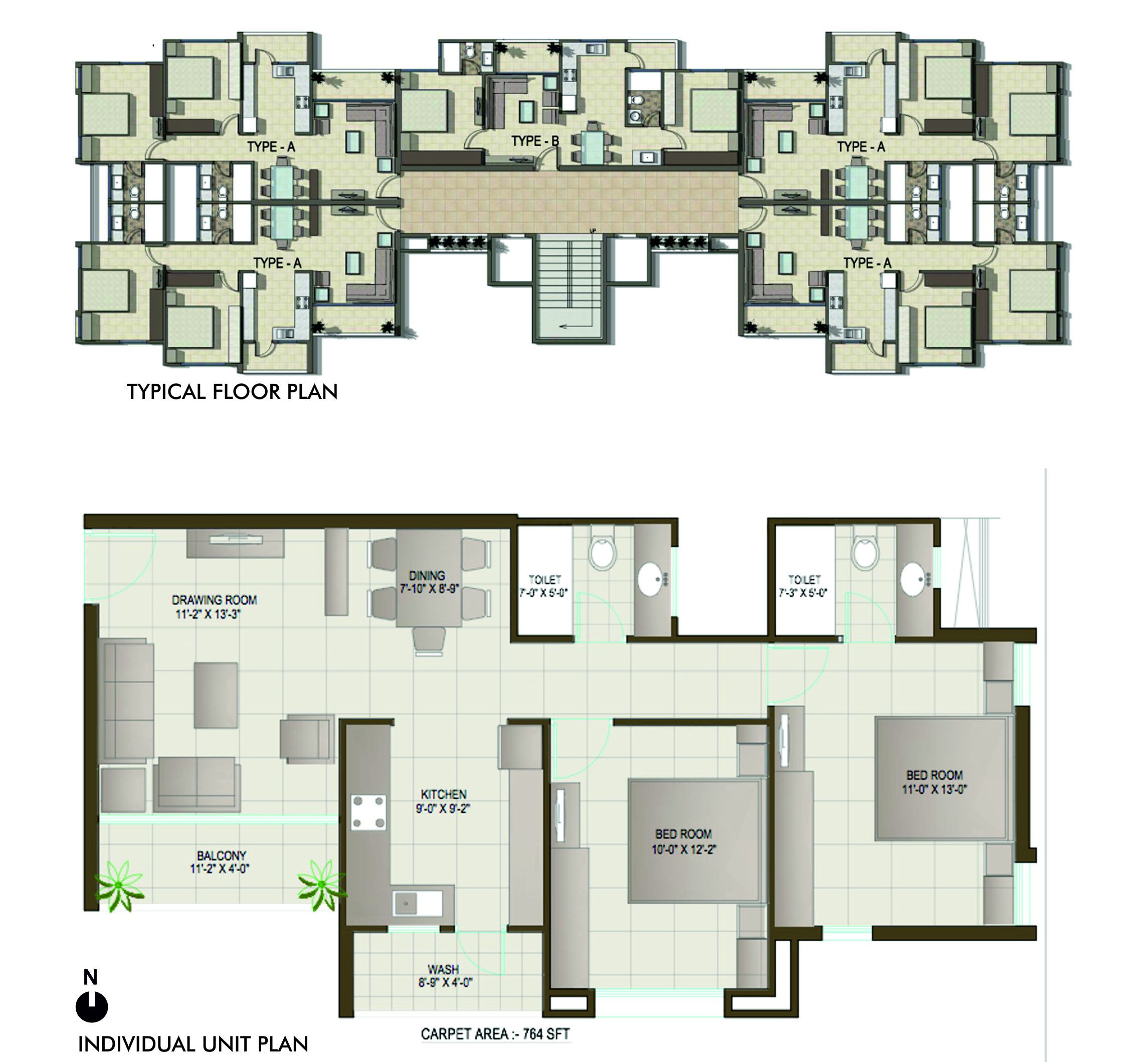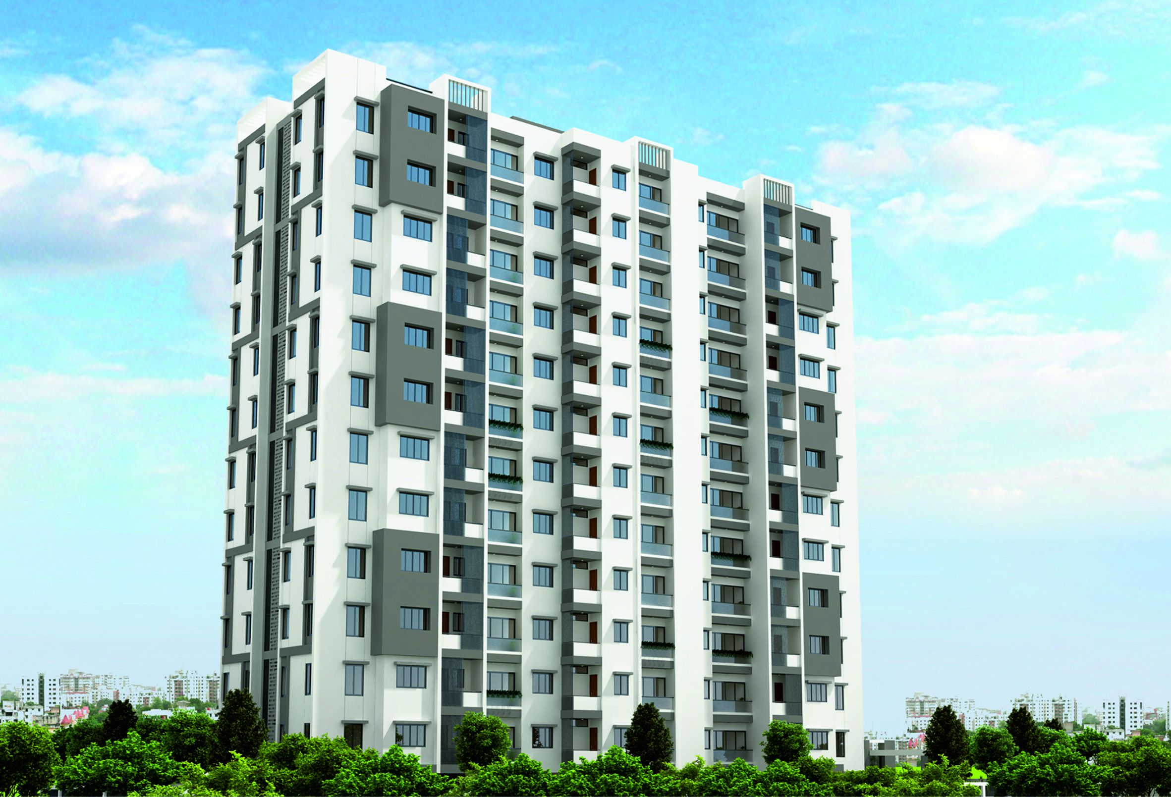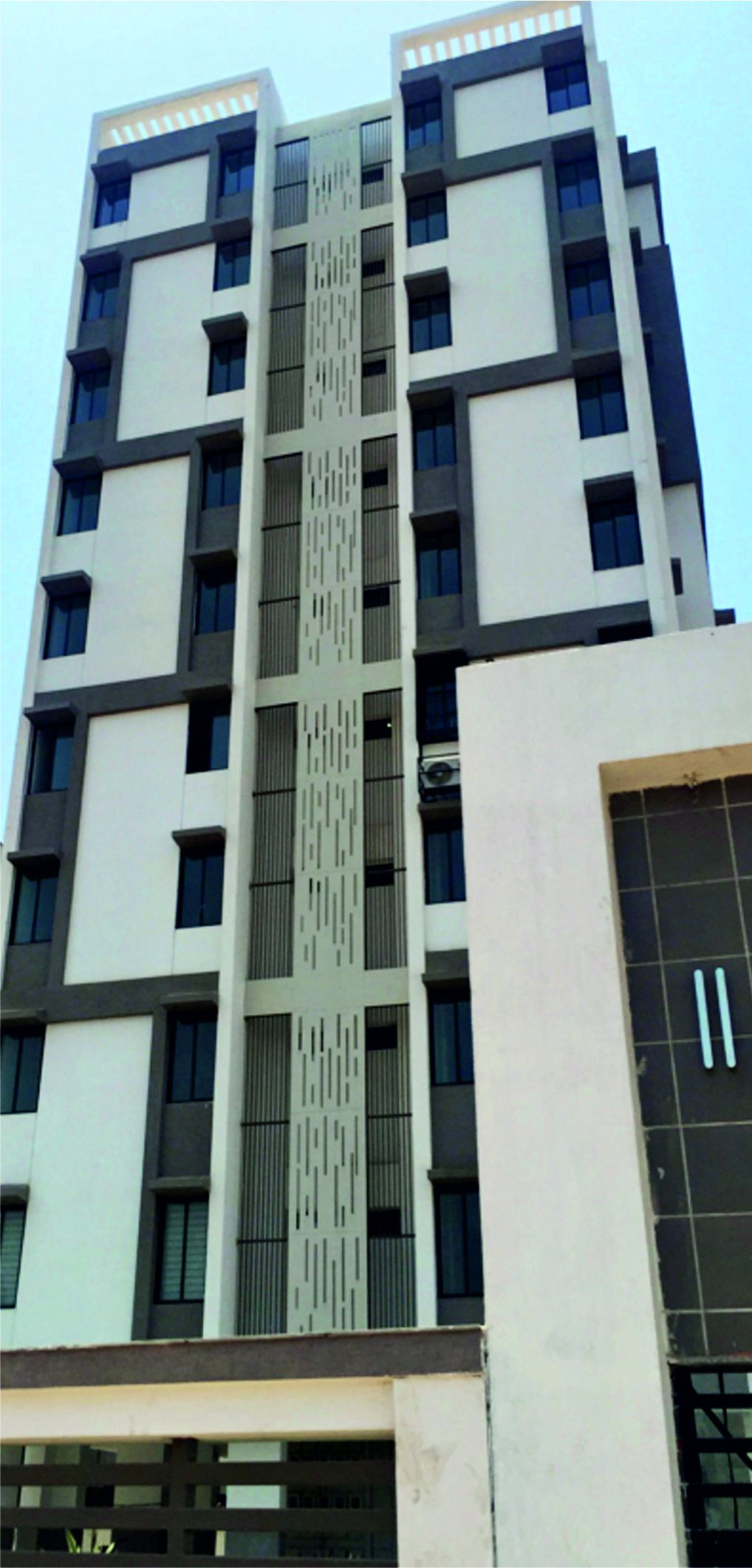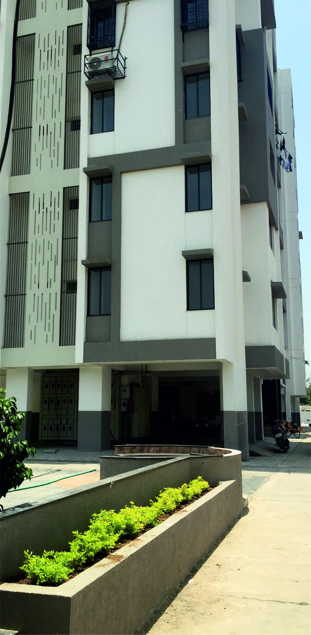 This tower, situated in the Chhani area of Vadodara is occupied predominantly by the people working in the big industries and corporate firms in the vicinity. Hence this becomes an easy commute to their workspace. The very layout of the building shows maximum optimization of the space. Within a small space, five apartments are comfortably sitting in each floor. The central lobby becomes an interaction space.